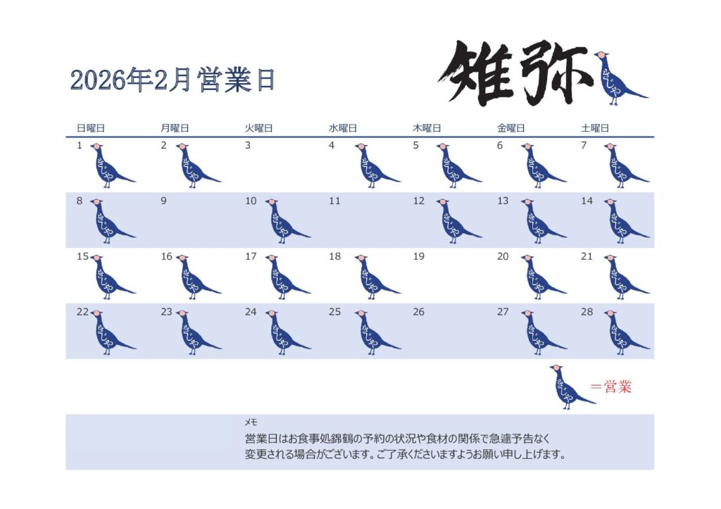雉弥 2月の営業予定日