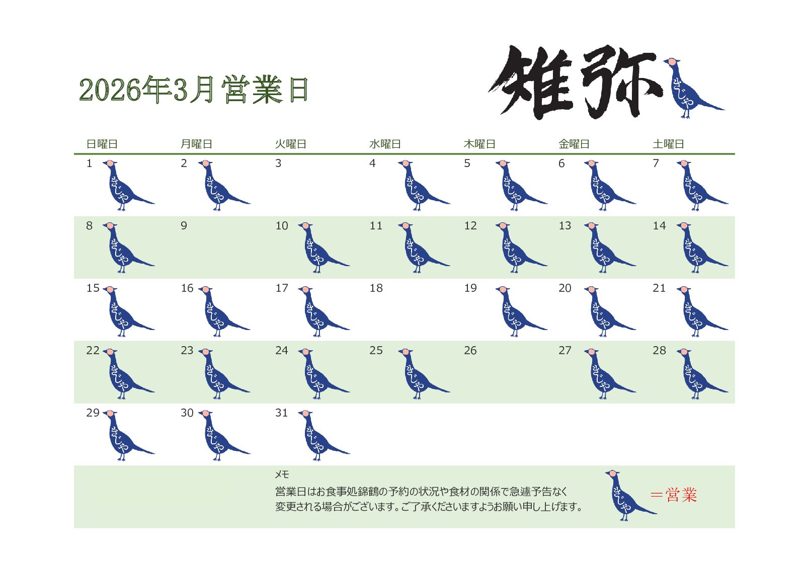 本日は2026年3月の雉弥営業予定日をお伝えさせていただきます。